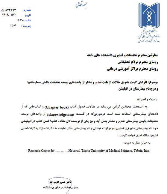 افزایش گرنت تشویق مقالات از بابت تقدیر و تشکر از واحدهای توسعه تحقیقات بالینی بیمارستان‌ها و درج نام بیمارستان در افیلیشن