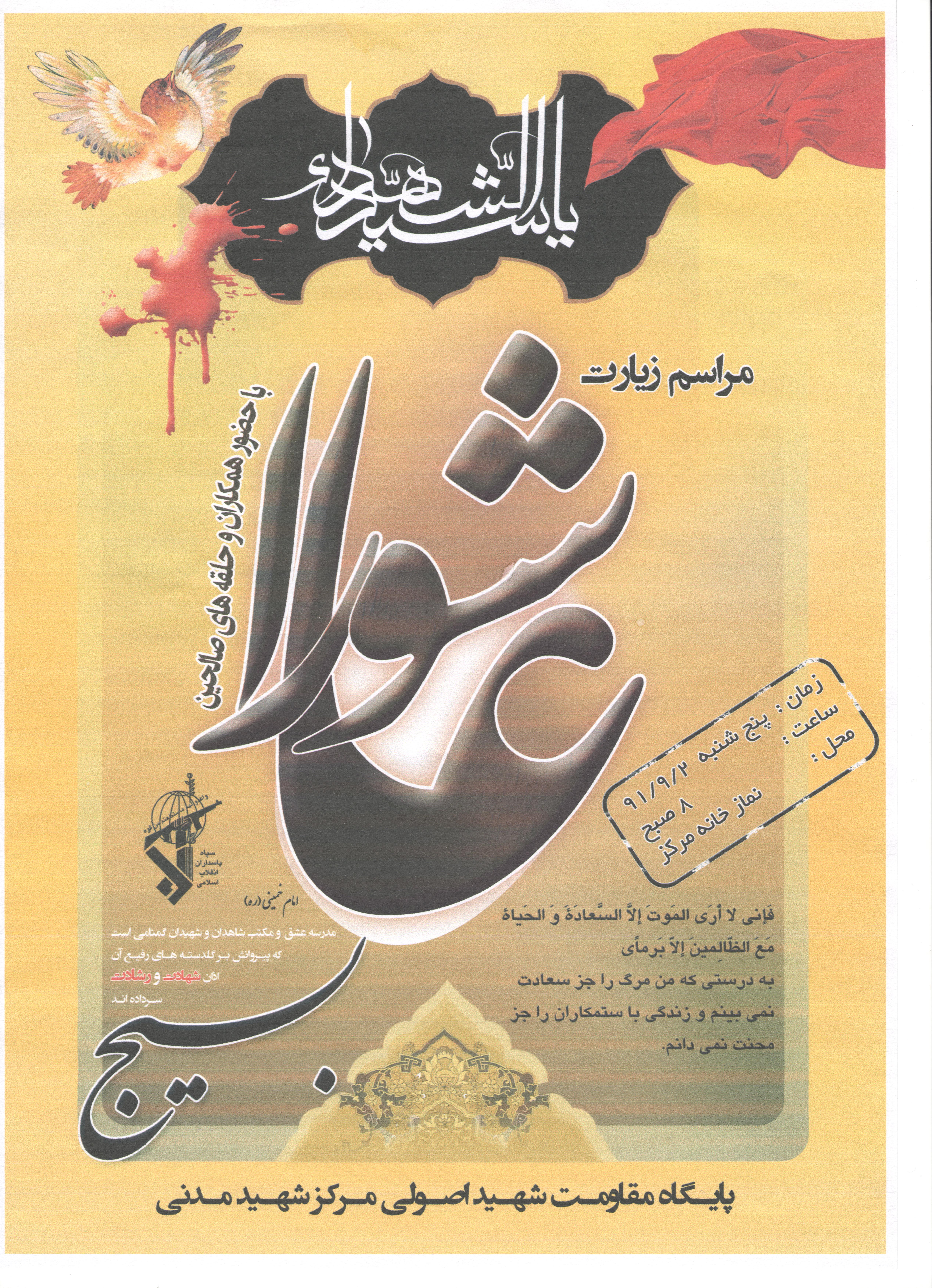 مراسم زیارت عاشورای حسینی روز پنجشنبه 91/9/2 در نماز خانه مرکز توسط پایگاه شهید اصولی مرکز آموزشی درمانی شهید مدنی برگزار خواهد شد.