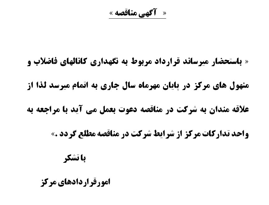 آگهی مناقصه آگهی مناقصه مربوط به نگهداري كانالهاي فاضلاب و منهول هاي مركز کد خبر : 72774 کپی کلمات کلیدی : مرکز قلب شهید مدنی آگهی مناقصه نگهداری کانالهای فاضلاب