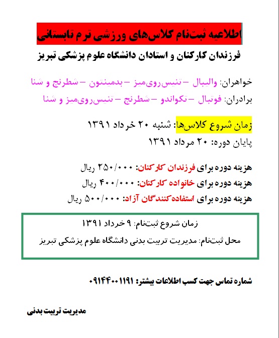 اطلاعيه ثبتنام كلاسهاي ورزشي ترم تابستاني دانشگاه علوم پزشکی تبریز